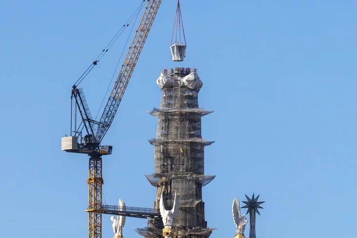 Финальный аккорд в строительстве вертикальной доминанты храма прозвучал в пятницу утром. Подъем верхней части 17‑метрового белого креста стал символом завершения наружных работ на комплексе из шести центральных башен.