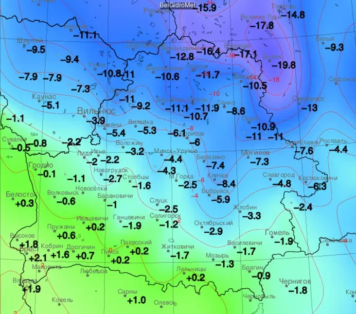 В Езерище было -17,1°С, а в Бресте — +2,1°С.