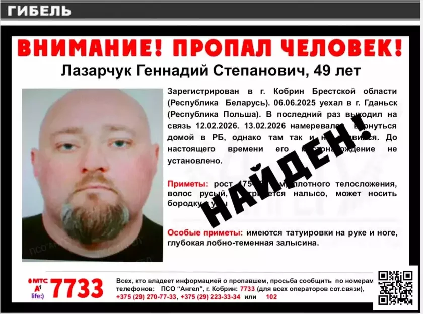 Вечером 19 февраля поисковый отряд «Ангел» сообщил об исчезновении 49‑летнего белоруса Геннадия Лазарчука, зарегистрированного в Кобрине.