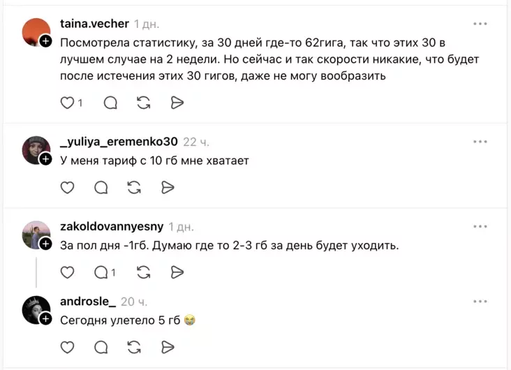 Мужчина пишет, что только за половину дня у него ушел 1 Гб. Другая комментаторша добавляет, что за день использовала 5 гигабайтов.