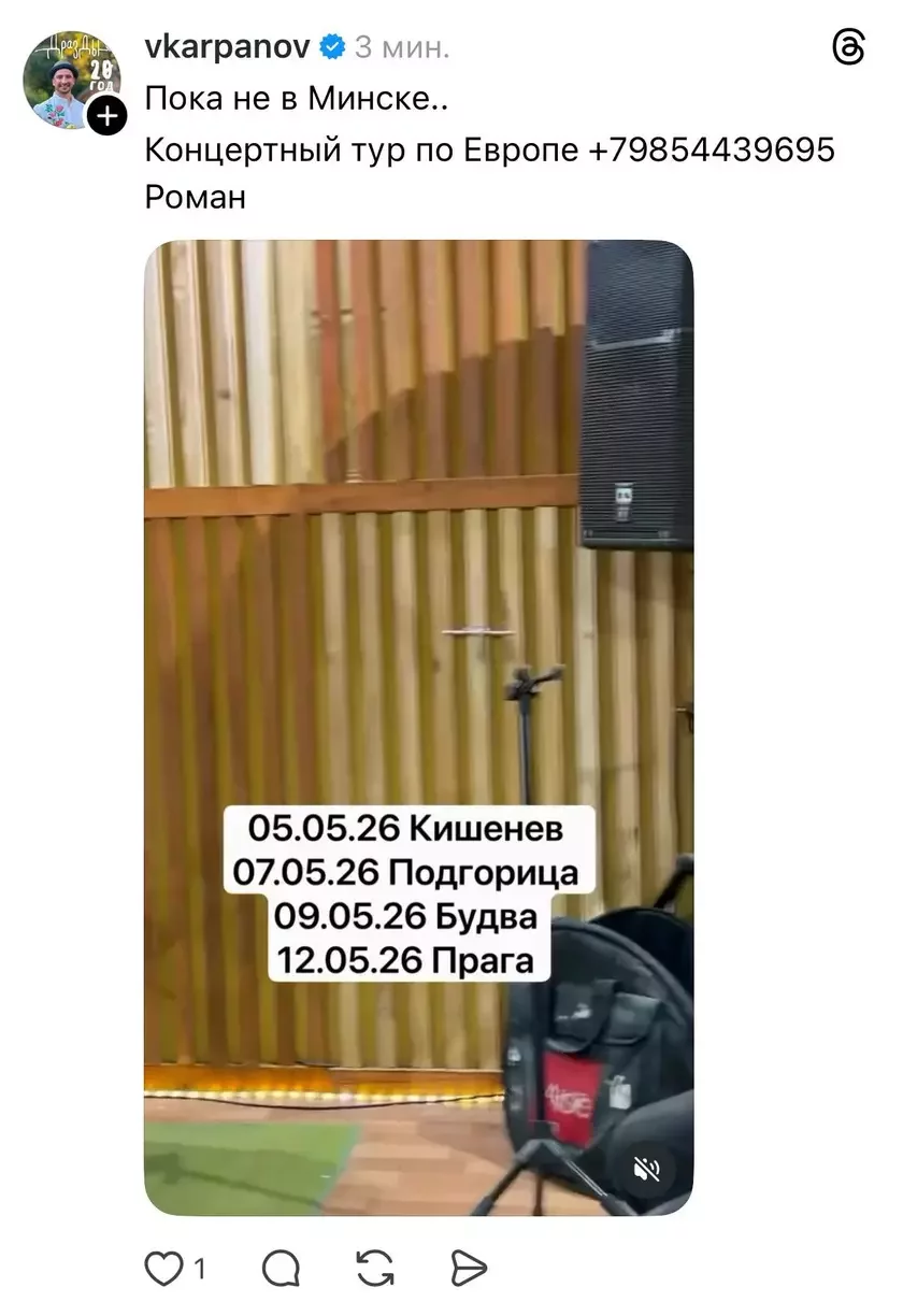 «Пока не в Минске… Концертный тур по Европе», — написал Карпанов.