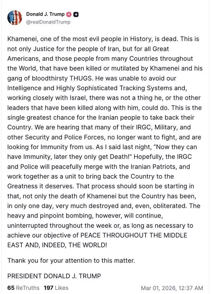 Президент США Дональд Трамп в публикации в своей соцсети Truth Social призвал стражей революции и полицию «слиться с Иранскими Патриотами и вернуть Стране Величие, которого она заслуживает».