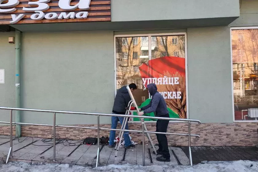 Фото работ возле магазина «Берёза у дома» (это сеть белорусских супермаркетов в Калининграде) разлетелось по местным пабликам. Двое рабочих на нём сдирают с окна наклеенную рекламу с белорусскоязычной надписью «Купляйце беларускае». Сразу появилась версия, что это делается из-за недавно изданного нового закона о русском языке в рекламе.