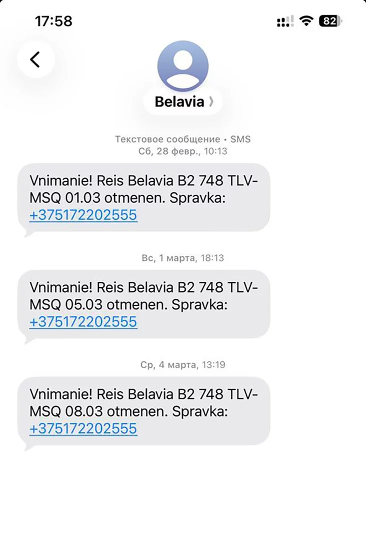Через несколько часов после первой сирены пришло сообщение от авиакомпании: рейс в Минск отменен.