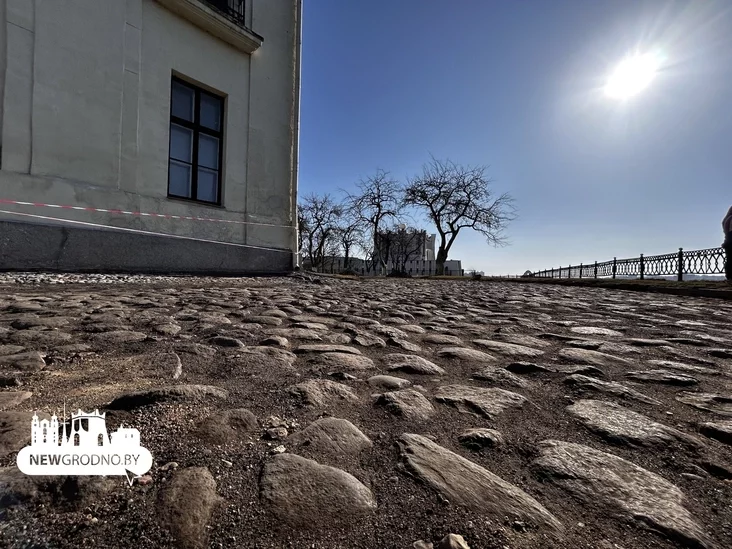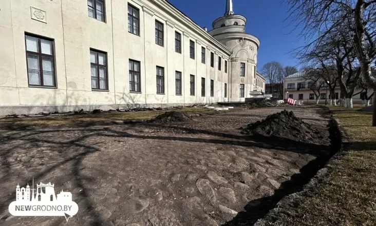 На территории Нового замка в Гродно развернулись масштабные работы по благоустройству. Один из этапов — обновление дорожек и проездов. Старый асфальт здесь сняли, чтобы положить новый слой покрытия, а под ним оказалось напоминание о старине, пишет newgrodno.by.