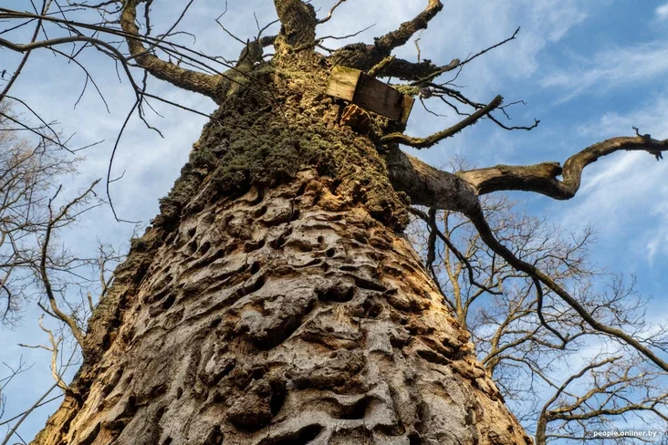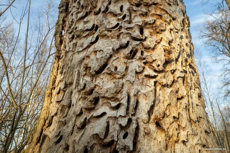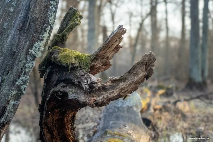Чем дальше в «водный» лес, тем сказочнее его атмосфера. Коряги, пни и поваленные деревья напоминают мифических существ, а на одном из стволов дуба мы замечаем «тайные знаки»… Разыгрывается воображение: кто же их оставил? От Ольги получаем прозаичный ответ: это поработала личинка редкого жука — большого дубового усача.