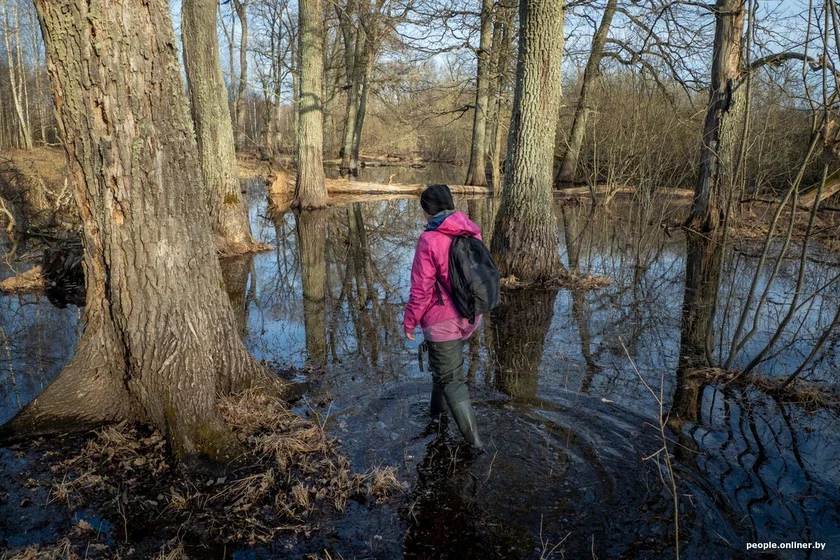Место, куда мы направляемся, находится на территории национального парка «Припятский». Это залитые пойменные дубравы. Идти туда в обычной обуви не вариант, поэтому надеваем высокие рыбацкие сапоги, которые выдала нам специалист по экологическому туризму нацпарка и гид по дикой природе Ольга Харитонович — именно она будет нашим проводником.
