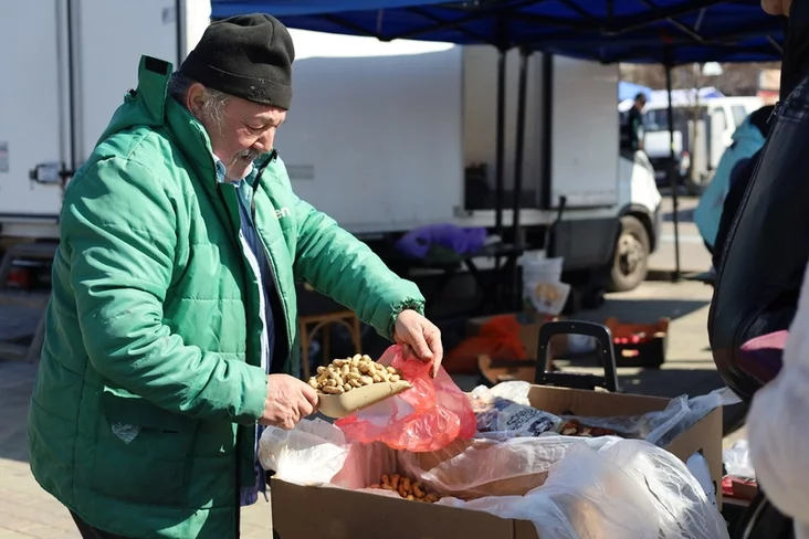 Большая очередь перед прилавком с ореховыми наборами и сухофруктами. Продавец отдает жареный арахис по 9 рублей за кило. Компотная смесь сухофруктов обойдется чуть дешевле, всего по 6 рублей.
