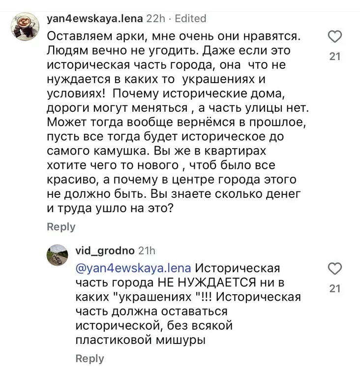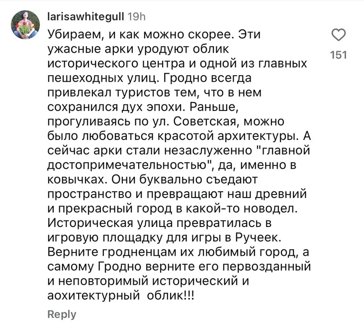 «Убираем — и как можно скорее. Эти ужасные арки портят облик исторического центра и одной из главных пешеходных улиц. Гродно всегда привлекал туристов тем, что в нем сохранился дух эпохи. Раньше, прогуливаясь по улице Советской, можно было любоваться красотой архитектуры. А теперь арки стали незаслуженно «главной достопримечательностью» — именно в кавычках. Они буквально съедают пространство и превращают наш древний и красивый город в какой-то новодел.