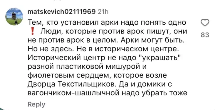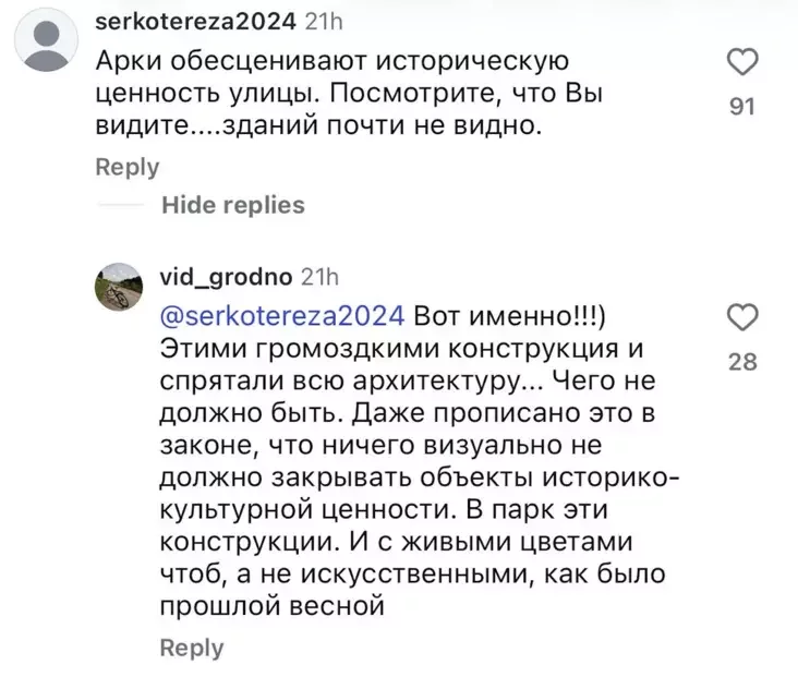 Подавляющее большинство комментаторов настаивает: арки нужно убрать. Основной аргумент — арки не вписываются в исторический центр. Люди пишут, что конструкции «перекрывают вид на здания», «уничтожают перспективу улицы» и делают центр визуально тяжелым, а зимой вообще похожи на похоронные венки. Особенно громко об этом говорят гродненские экскурсоводы и местные блогеры, комментарии которых собирают десятки и сотни лайков.