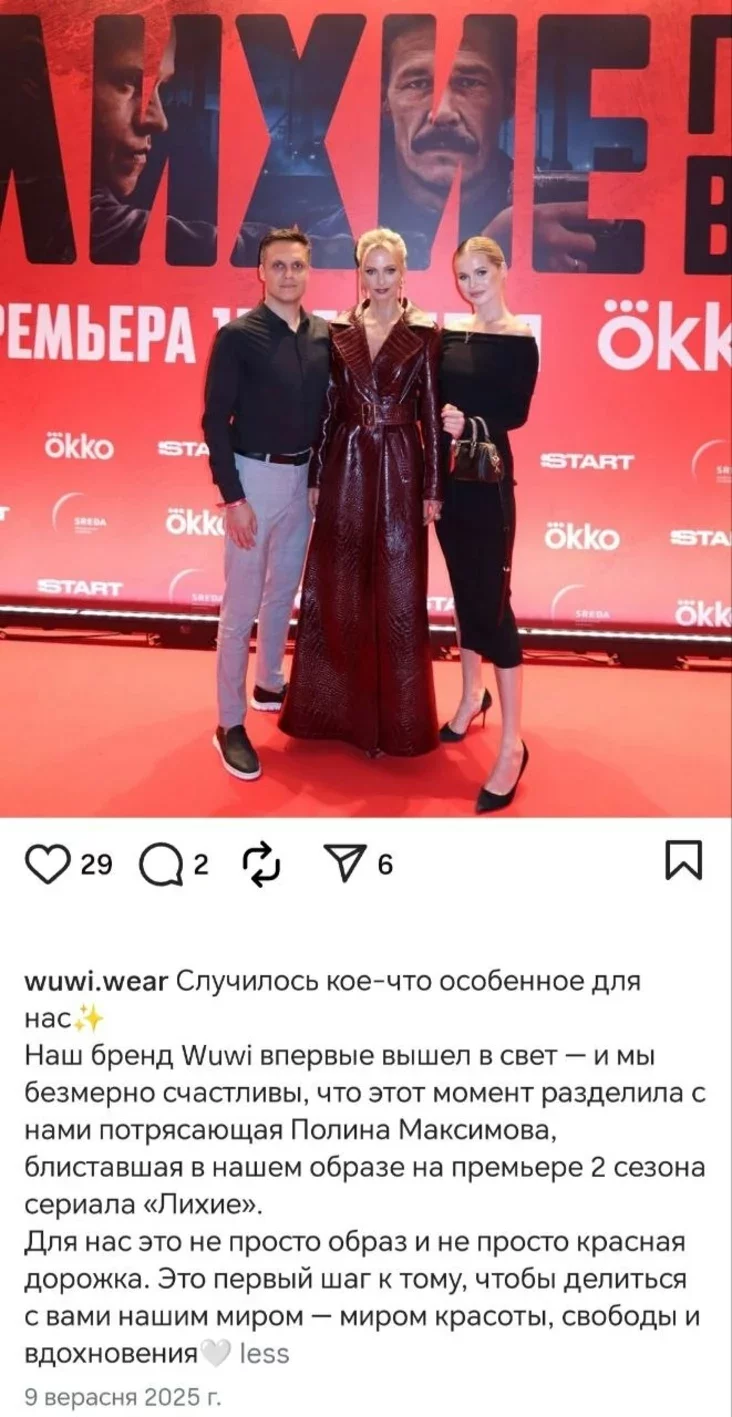 Барановская в Threads просит поддержать их с подругой. А сама пока пытается продвигать бренд в России через каких-никаких знаменитостей. В инстаграме Wuwi несколько постов посвящено тому, что в их образе на премьеру второго сезона сериала «Лихие» пришла российская актриса Полина Максимова.
