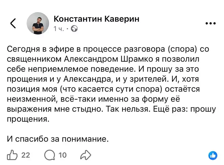 «И хоть позиция моя (что касается сути спора) остается неизменной, все же именно за форму ее высказывания мне стыдно. Так нельзя», — написал ведущий.