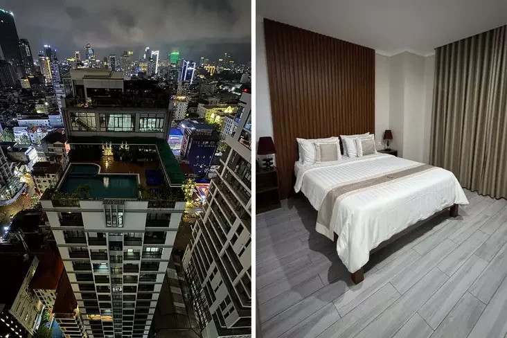 В Пномпене ночевали в отеле около автовокзала за $33,5 с завтраком и на обратном пути в апарт-отеле в центре за $28,5. Оба варианта были оптимальны по соотношению цены и качества.