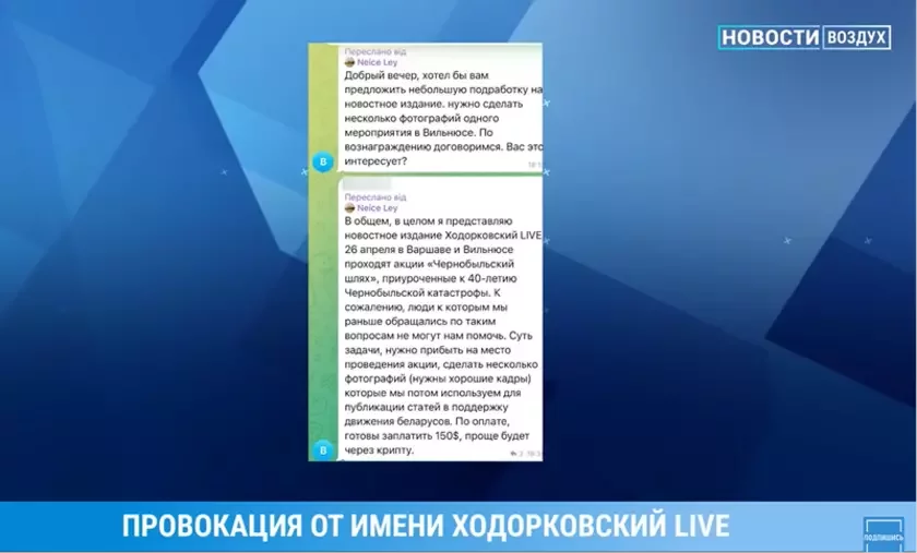 В Вильнюсе неизвестные лица, представляясь сотрудниками издания «Ходорковский LIVE», предлагали деньги за съемку акции «Чарнобыльскі шлях». Об этом сообщила сама редакция, получив скриншоты из телеграм-чата украинцев в Литве, пишет Белорусская ассоциация журналистов.