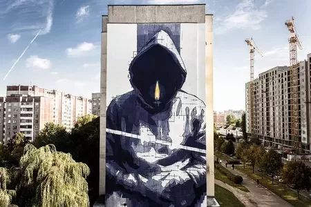 Жители дома напротив просят закрасить граффити «человека без идентичности» в Минске, называют «ангелом смерти»5353
